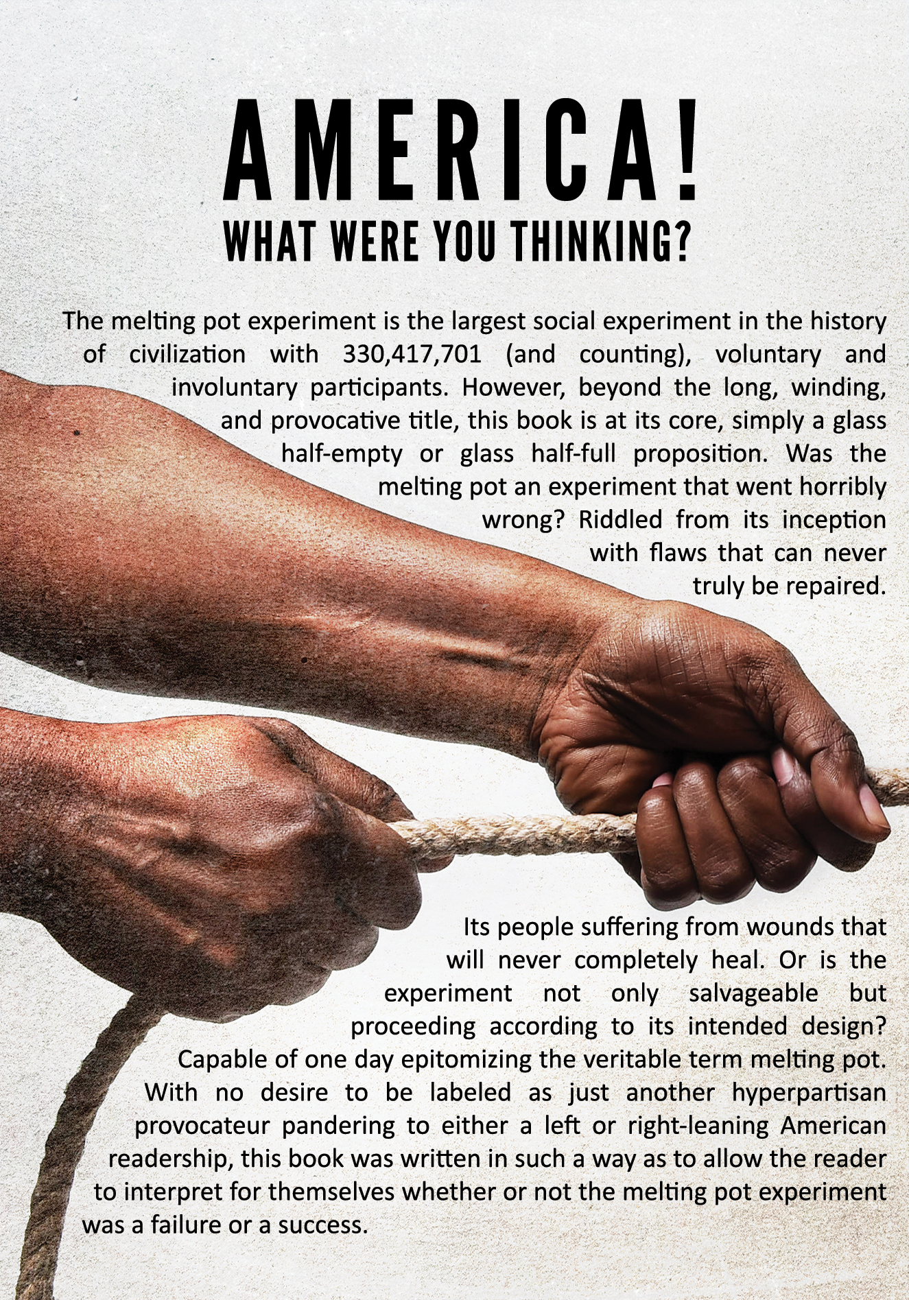 With no desire to be labeled as just another hyperpartisan provocateur pandering to either a left or right-leaning American readership, this book was written in such a way as to allow the reader to interpret for themselves whether or not the melting pot experiment was a failure or a success. And if the reader happens to be an American citizen living inside the experiment, to also decide for themselves whether or not the time has come to abandon the experiment en masse (migration), or if the experiment is by no means over and worthy of the continuation of the fight to make it the more perfect union that it has the potential to become.